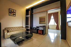 A spacious and bright rooms measuring 350 sqft. The Executive Suite room comes with 1 king sized bed with bathroom, living hall and a maximum occupancy of 2 adults. |