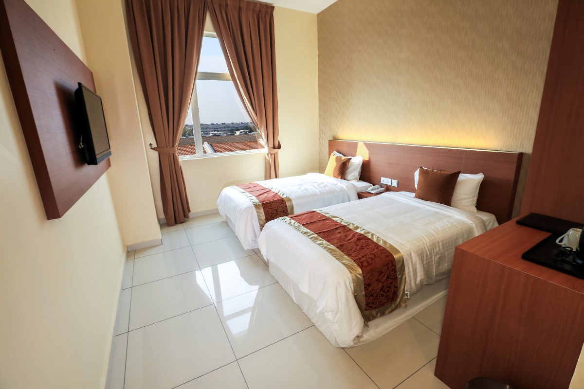 A spacious and bright rooms measuring 280 sqft. The Deluxe Twin room comes with 2 single sized bed with bathroom and a maximum occupancy of 2 adults.